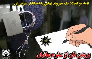 یکی از شهروندان بهایی ساکن استان مازندران که محل کسب او همراه با تعداد پرشماری از دیگر بهاییان این استان پلمب شده به استاندارد این استان نامه ای سرگشاده نوشته است. وی دلیل این نوع نامه نگاری را عدم موفقیت در کسب فرصت ملاقات با این مقام مسئول عنوان داشته است. این شهروند بهایی در قسمتی از نامه خود آورده است “بستن مغازه های اشخاص زحمت کش وصدیقی چون بهاییان که صرفا به دلیل اعتقادشان به آیین بهایی ، مشمول چنین مجازات هایی می شوند – که درجهان امروز منحصربفرد به نظرمی رسد – نه تنها برخلاف همه ی قوانین حقوق بشری و میثاق های بین المللی – که مورد قبول ایران نیز قرار گرفته – می باشد بلکه از نظر قوانین داخلی و شرع مبین اسلام نیز دررابطه با حقوق شهروندی مخالفت و مغایرت تام داشته و دارد.”