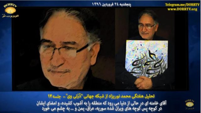 محمد نوریزاد در هفدهمین تحلیل هفتگی از شبکه جهانی «دُرّ تی وی» به خبر وخامت حال آقای خامنه ای رهبر نظام پرداخت، و آن را مورد بررسی قرار داد. محمد نوریزاد گفت آقای خامنه ای در حالی از دنیا می رود که منطقه را به آشوب کشیده، و امضای ایشان در کوچه پس کوچه های ویران شده سوریه، عراق، یمن، نیجریه و … به چشم می خورد.