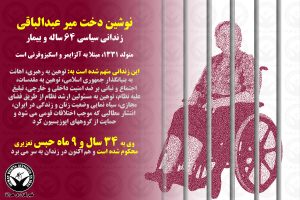 نوشین دخت میر عبدالباقی زندانی ۶۴ ساله بند نسوان (زنان) زندان اوین علاوه بر کهولت سن از بیماریهای متعدد جسمی و روحی رنج می برد، وی که به آلزایمر پیشرفته مبتلا است و گواهی عدم تحمل حبس او توسط پزشکی صادر شده به دلایل عقیدتی به ۳۴ سال و ۹ ماه حبس تعزیری محکوم شده است. علاوه بر اتهامات متعدد توهین به مسئولان و بنیانگذاران نظام وی متهم به “سیاه نمایی وضعیت زنان و زندگی در ایران” شده است.