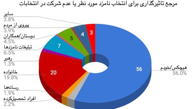 ۵۶ درصد پاسخ دهندگان یک نظرسنجی در ایران: بنا به تشخیص فردی رای دادیم و فقط ۱.۳ درصد به توصیه خامنه ایدود ۴۰ درصد از رایدهندگان به ابراهیم رئیسی و ۳۶ درصد از رایدهندگان به حسن روحانی گفته اند نمیدانند که آنها اصلاح طلباند، اصولگرا هستند یا میانهرو/ اعتدالگرا؟