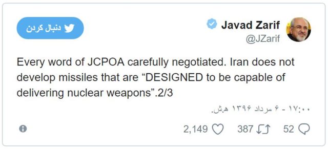 آقای ظریف میگوید همه جزئیات توافق به دقت در مذاکرات تعیین شده و ایران موشکی که برای حمل کلاهکهای هستهای “طراحی شده باشد” آزمایش نکرده است.