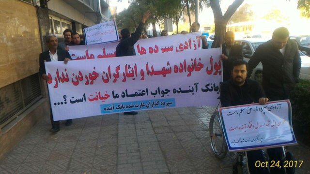 تجمع مالباختگان و از جمله خانواده کشته شدگان جنگ ایران و عراق موسسه افضل توس، مقابل سرپرستی بانک آینده مشهد، دوم آبان ۹۶
