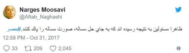 نرگس موسوی، یکی از دختران میرحسین موسوی و زهرا رهنورد، در واکنش به اظهارات شمخانی درباره “حصر” در توییتر نوشته است: «زهرا رهنورد و میرحسین موسوی همچنان در حصر خانگی هستند و از دیدن اقوام و دوستان خود کمافیالسابق محروم هستند». او در توییت دیگری، همچون حسین کروبی، اعلام کرده است: «ظاهرا مسئولین به نتیجه رسیدهاند که به جای حل مساله، صورت مساله را پاک کنند».