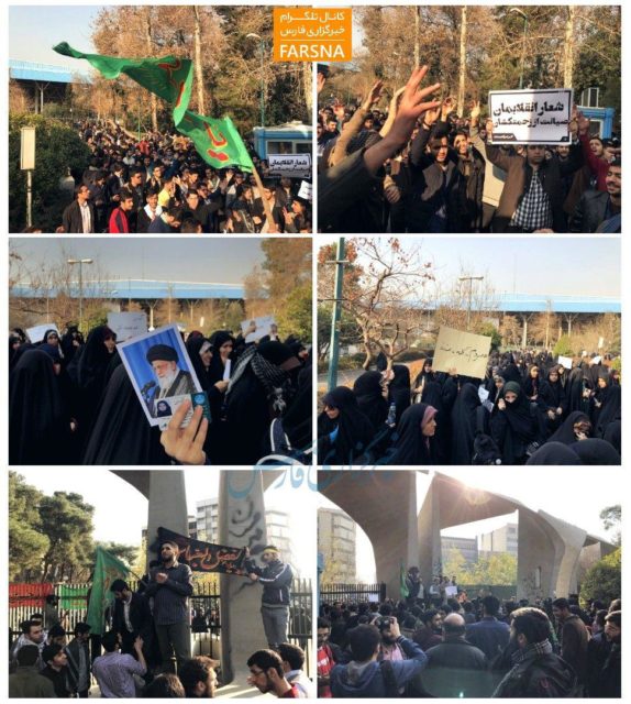خبرگزاری ایسنا درباره این تجمع نوشته است: ظهر امروز (یک شنبه) جمعی از دانشجویان بسیجی دانشگاه تهران با ایجاد تجمعی جلوی در اصلی این دانشگاه در خیابان انقلاب اسلامی شعارهایی علیه وضعیت اقتصادی سر داده و حمایت خود را از نظام اعلام کردند. آنها با در دست داشتن پرچم قرمز یا حسین(ع) و پلاکاردهایی شعار هایی از جمله «ننگ ما ننگ ما مسئول بیدرد ما»، «لبیک یا خامنهای»، «مرفهین بیدرد مایه ننگ ملت» سر دادند. بر روی سر در اصلی دانشگاه تهران شعارهایی همچون «لبیک یا خامنهای»، «دانشگاه جای فتنهگر نیست» دیوارنویسی شده.