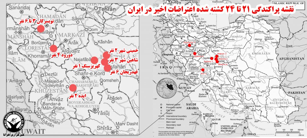 فرماندار دورود در گفتگو با ایسنا (۱۱ دیماه): ۴ نفر در حوادث اخیر دورود کشته شدند، نماینده ایذه و باغ ملک در گفتگو با ایلنا (۱۱ دیماه): ۲ نفر در ایذه کشته شدند، روزنامه خراسان به نقل از صدا و سیما (۱۲ دیماه): در تویسرکان ۳ تا ۶ نفر کشته شدند، باشگاه خبرنگاران جوان (۱۲ دیماه): ۱ نیروی سپاه در کهریزسنگ استان اصفهان کشته شد، روزنامه خراسان (۱۲ دیماه): ۳ نفر در شاهین شهر استان اصفهان کشته شدند، خبرگزاری فارس (۱۲ دیماه): ۶ نفر در قهدریجان استان اصفهان کشته شدند.، باشگاه خبرنگاران جوان (۱۲ دیماه): ۲ نفر در خمینی شهر استان اصفهان کشته شدند.