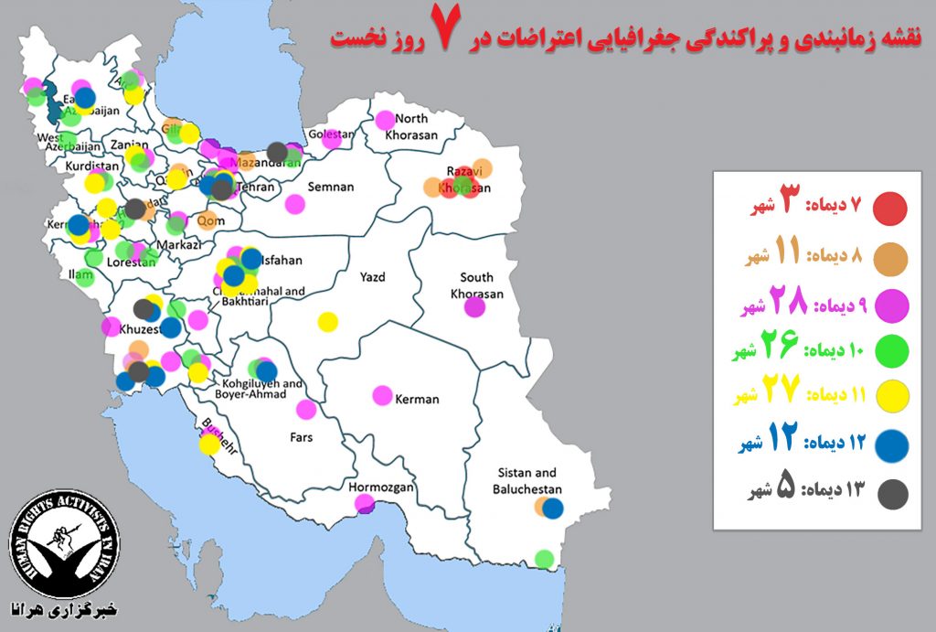 بنابر گزارش پیش رو، اعتراضات در ایران در طی ۷ روز در تمام ۳۱ استان ایران، در ۶۹ شهرستان و ۷۱ شهر گسترش یافت.