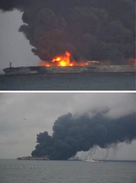 برخورد یک نفتکش ایرانی با کشتی باری چینی در شرق چین موجب آتشسوزی و مفقود شدن کارکنان نفتکش شد. نفتکش مذکور به نام “سانچی” متعلق به شرکت ملی نفتکش ایران و حامل ۱۳۶ هزار تن میعانات گازی بوده است که این میعانات متعلق به شرکت ملی نفت ایران بوده است.