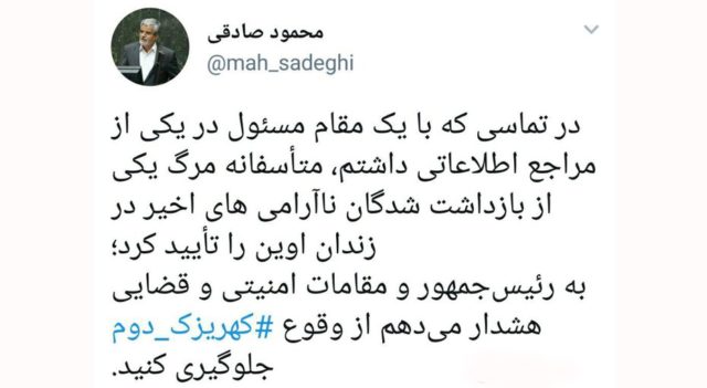 محمود صادقی، نماینده تهران در مجلس هم در توییتی نوشته است: «به رئیس جمهور و مقام های امنیتی و قضایی هشدار می دهم از وقوع کهریزک دوم جلوگیری کنید.»