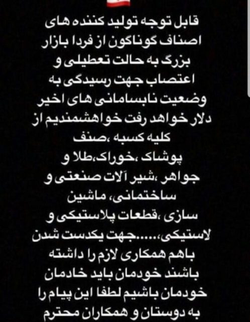 اطلاعیه بازار بزرگ تهران خطاب به کلیه اصناف - سه شنبه, 21ام فروردین, 1397 اندازه قلم متن @faryad_3 @kharduni اشتراکگذاری این: اشتراکگذاری در X (در پنجرۀ تازه باز میشود) X به اشتراک گذاشتن در فیسبوک (در پنجرۀ تازه باز میشود) فیسبوک Related به کانال تلگرام سایت ملیون ایران بپیوندید برچسبها: اطلاعیه بازار بزرگ تهران, خطاب به کلیه اصناف