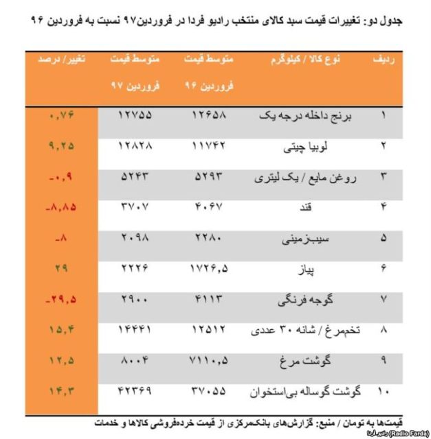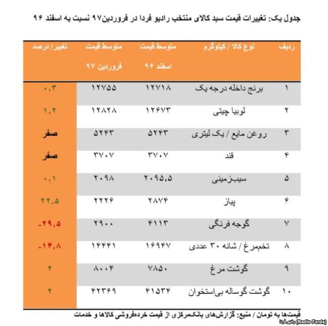 مبدا مقایسه تغییر قیمت اقلام سبد کالای منتخب رادیو فردا از اسفندماه پارسال به فرودین ماه سال ۹۶، نشان میدهد که میانگین قیمتی این سبد کالایی در فروردین امسال نسبت به ماه مشابه پارسال، ۴٫۲ درصد رشد کرده است.