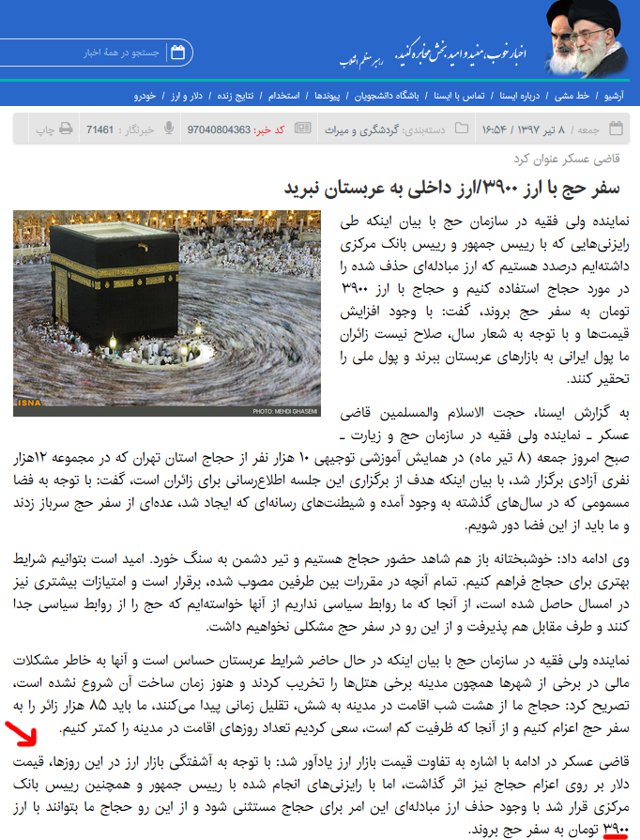دماوند، در اوج بحران ارزی مملکت، نماینده ولی فقیه در سازمان حج و زیارت گفته که برای سفر حج امسال به حاجیها دلار با نرخ مبادلهای یعنی ۳۹۰۰ تومان ارائه میشود. این در حالیست که نرخ دلار در بازار آزاد به حدود ۹۰۰۰ تومان رسیده و خرید و فروش آن هم عملا انجام نمیشود.