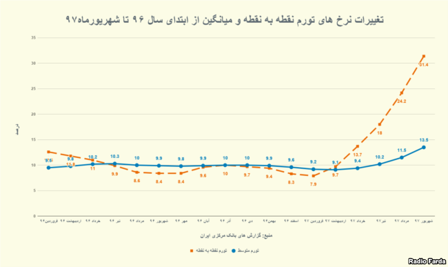 اما آمار و ارقام نگرانکننده گزارش بانک مرکزی از تورم شهریوماه ۹۷، تورم نقطه به نقطه ۳۱.۴ درصدی است که از شتاب و جهش افزایش قیمتها حکایت دارد.