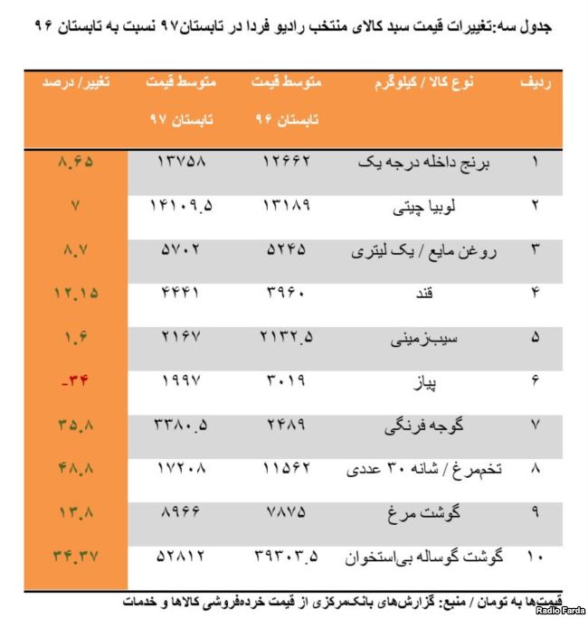 در جدول شماره سه، قیمت سبد کالای منتخب رادیوفردا در دو مقطع تابستان امسال و تابستان پارسال مقایسه شده است.