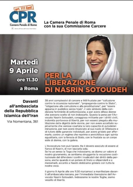 وکلای شهر رم روز ۹ آوریل ساعت ۱۱.۳۰ با لباس وکالت در مقابل سفارت ایران در شهر رم در اعتراض به حکم ۳۸ سال زندان و ۱۴۸ ضربه شلاق نسرین ستوده حاضر خواهند شد./ عفو بین الملل
