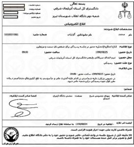 در احضاریه ای که اخیرا به دست خانواده آقای گونیلی رسیده است از وی خواسته شده است که در تاریخ ۲۵ آبان ماه ۹۸ در ارتباط با اتهام “اقدام علیه امنیت ملی و جاسوسی به نفع کشورهای متخاصم” در شعبه دوم دادگاه انقلاب تبریز حاضر شود.
