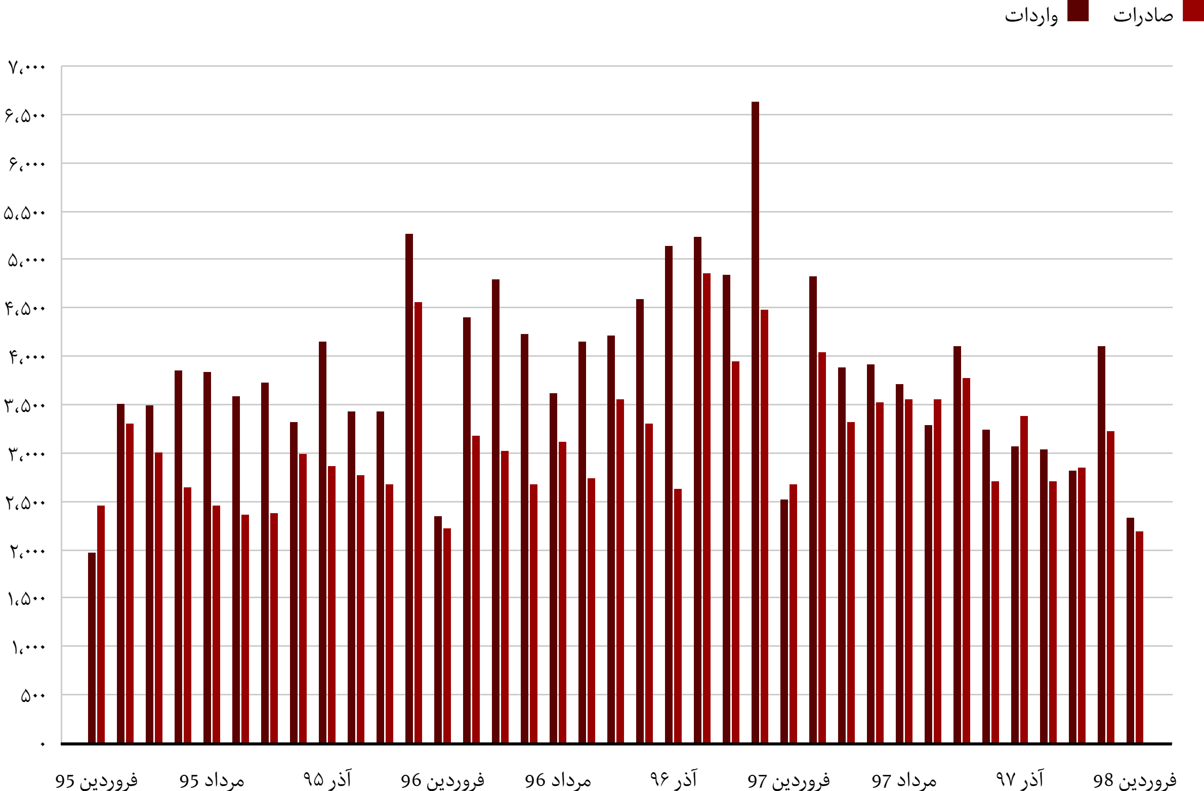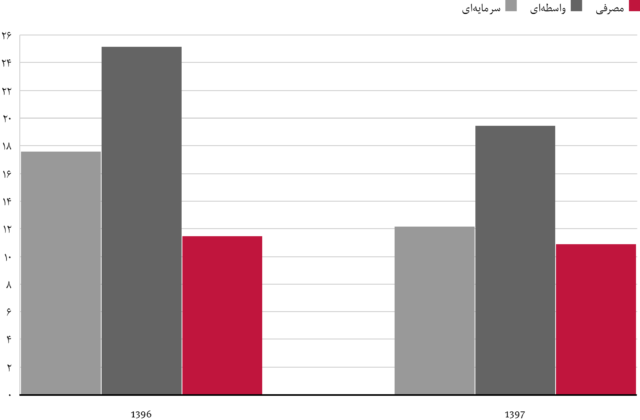 مقایسه ترکیب واردات در سالهای ۱۳۹۶ و ۱۳۹۷ نشان میدهد که حجم واردات کالاهای مصرفی تقریبا ثابت مانده، اما واردات کالاهای سرمایهای یا واسطهای، یعنی آنچه در تولید محصولات دیگر استفاده میشود، پایین آمده است.