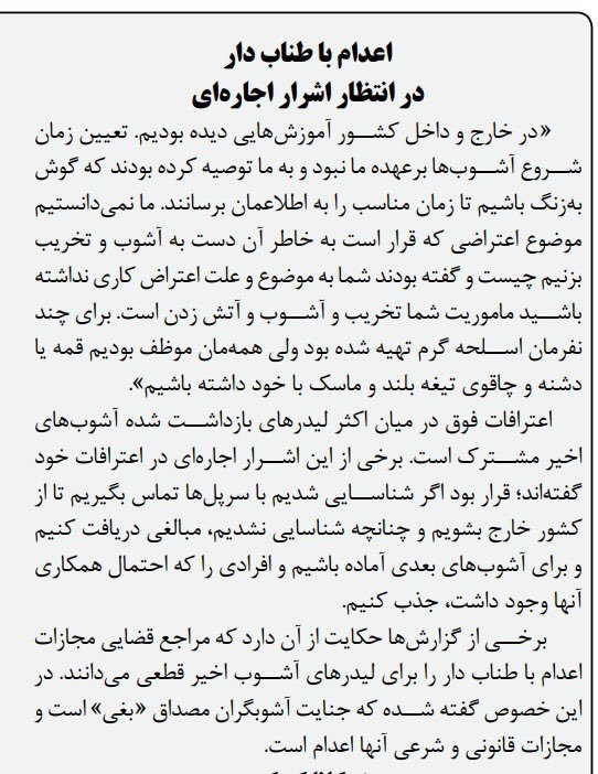 «اعدام با طناب دار»، وعدهای بود که نخستین بار در روز چهارم از اعتراضات سراسری آبانماه از سوی روزنامه کیهان وابسته به رهبر جمهوری اسلامی مطرح شد.