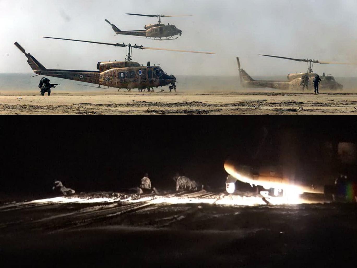 تصویر بالا: سه فروند بالگرد بل ۲۱۴آ هوانیروز ارتش در حال تخلیه نیروهای تیپ ۲۲۳ واکنش سریع نیروی زمینی ارتش در سواحل مکران/ تصویر پایین: هلی برن نیروهای مخصوص در شبهنگام در سواحل مکران- تصاویر از وبسایت رسمی ارتش جمهوری اسلامی ایران