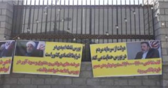 در بنرهایی دیگر تصاویر وزیر اقتصاد و رییس کمیسیون اقتصادی مجلس دیده میشود که جملاتی در زمینه «صعودی شدن دوباره بورس» و «توزیع ثروت» از طریق عرضه سهام گفته بودند.