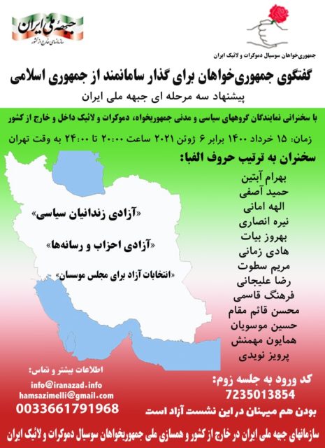 نشست مجازی با موضوع گذار سامانمند از جمهوری اسلامی و پیشنهاد سه مرحله ای جبهه ملی ایران - دوشنبه, 10ام خرداد, 1400 اندازه قلم متن ورود برای عموم آزاد است اشتراکگذاری این: اشتراک گذاشتن توسط اس ام اس (در پنجرۀ تازه باز میشود) X برای اشتراکگذاشتن فیسبوک خود کلیک کنید (در پنجرۀ تازه باز میشود) فیسبوک Related به کانال تلگرام سایت ملیون ایران بپیوندید