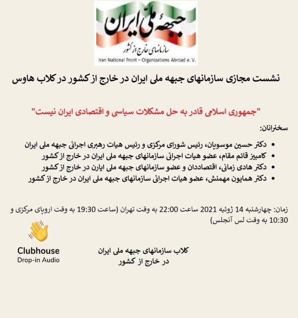 نشست مجازی سازمانهای جبهه ملی ایران در خارج از کشور در کلاب هاوس با عنوان: “جمهوری اسلامی قادر به حل مشکلات سیاسی و اقتصادی ایران نیست” - 5 سال پیش