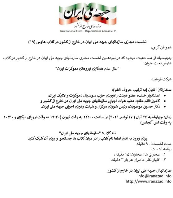بدینوسیله از شما دعوت میشود که در نوزدهمین نشست مجازی سازمانهای جبهه ملی ایران در خارج از کشور در کلاب هاوس تحت عنوان: