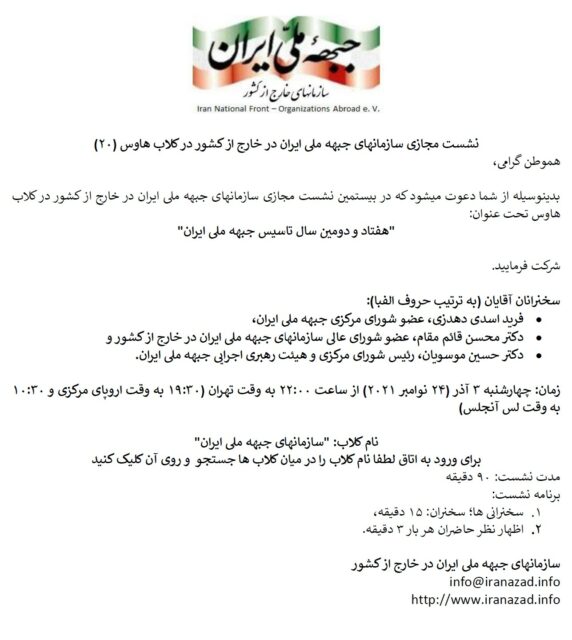 بدینوسیله از شما دعوت میشود که در بیستمین نشست مجازی سازمانهای جبهه ملی ایران در خارج از کشور در کلاب هاوس تحت عنوان: