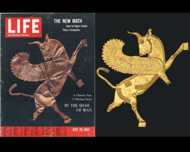 از میان این گنجینه غنی، محمدرضا شاه یک اثر هنری در مقیاس بسیار کوچکتر را برای روی جلد مجله انتخاب کرد: نقش برجستهای طلایی از یک گاو بالدار به ارتفاع کمی بیش از ۲۴ سانتیمتر که قدمت آن به امپراتوری هخامنشی ایران (۵۵۰-۳۳۰ قبل از میلاد) برمیگردد.