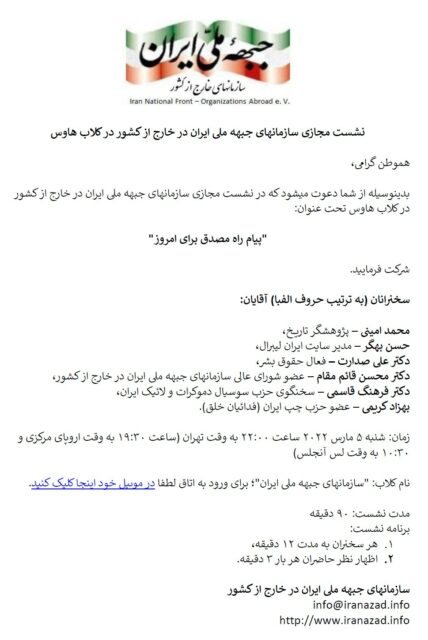 بدینوسیله از شما دعوت میشود که در نشست مجازی سازمانهای جبهه ملی ایران در خارج از کشور در کلاب هاوس تحت عنوان: