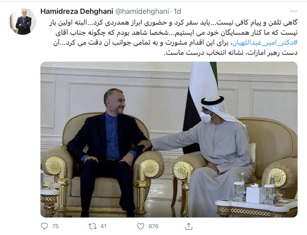 حمیدرضا دهقانی سفیر ایران در قطر نیز نوشته است: «گاهی تلفن و پیام کافی نیست…باید سفر کرد و حضوری ابراز همدردی کرد…البته اولین بار نیست که ما کنار همسایگان خود می ایستیم…شخصا شاهد بودم که چگونه جناب آقای دکتر امیرعبداللهیان، برای این اقدام مشورت و به تمامی جوانب آن دقت می کرد…آن دست رهبر امارات، نشانه انتخاب درست ماست.»