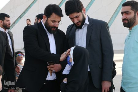 خواننده میخواند: هوادارت میشم گرفتارت میشم/ علی بن مهزیارت میشم/ با همین قد کوچیکم خودم سردارت میشم.