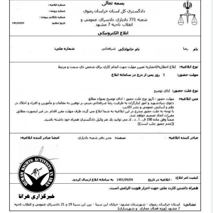 در این ابلاغیه در تاریخ ۴ تیرماه ۱۴۰۱ صادر و ابلاغ شده است، از آقای شرفخانی خواسته شده تا ظرف مدت ۵ روز از زمان درج ابلاغیه در سامانه ثنا، جهت ادای توضیحات در خصوص اتهامات “توهین به مقامات و مامورین، افترا و نشر اکاذیب و اخلال در نظم و آسایش عمومی” در شعبه ۷۷۱ دادسرای انقلاب ناحیه ۷ مشهد حاضر شود.