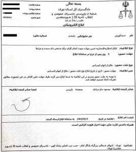 براساس ابلاغیه‌ای که در تاریخ ۱۳ تیرماه صادر و به این شهروند ابلاغ شده است، از آقای زعیم خواسته شده تا ظرف مدت پنج روز از زمان صدور ابلاغیه جهت دفاع از اتهامات انتسابی در شعبه ۲ بازپرسی داسرای اوین به ریاسی قاضی حاجی مرادی حاضر شود.