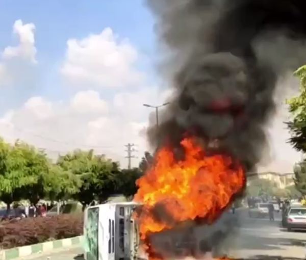 همچنین شماری از معترضان روی خودروی نیروهای امنیتی که چپ شده ایستاده و علیه خامنهای شعار دادند.