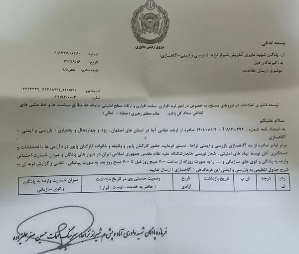 این نامه به امضای حسین صفرعلیزاده، فرمانده پادگان «شهید داوری آماویش شیراز (بازرسی ایمنی و رسیدگیها)» رسیده است.