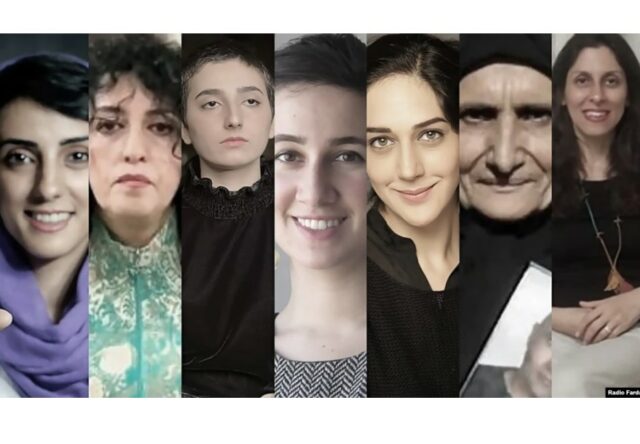 از راست به چپ: نازنین زاغری- رتکلیف، گوهر عشقی، زر امیرابراهیمی، نیلوفر بیاتی، رویا پیرایی، نرگس محمدی و الناز رکابی