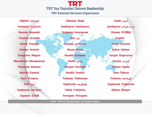 رجبطیب اردوغان، رئیس جمهوری ترکیه، روز جمعه نهم دسامبر، در جریان برگزاری ششمین همایش بینالمللی «تیآرتی ورلد» در هتل «هیلتون بومونتی» استانبول، از افتتاح شبکههای دیجیتالی به زبانهای فارسی و اسپانیایی در سال ۲۰۲۳ خبر داد. اردوغان گفت: «مسیری که در سال ۲۰۲۰ با تیآرتی عربی و ورلد آغاز شد، با راهاندازی شبکههای دیجیتالی آلمانی و روسی ادامه یافت. این مسیر در سال ۲۰۲۳ نیز با افتتاح شبکههای دیجیتالی تیآرتی به زبانهای فارسی و اسپانیایی، به پیشروی در این زمینه ادامه خواهد داد.»