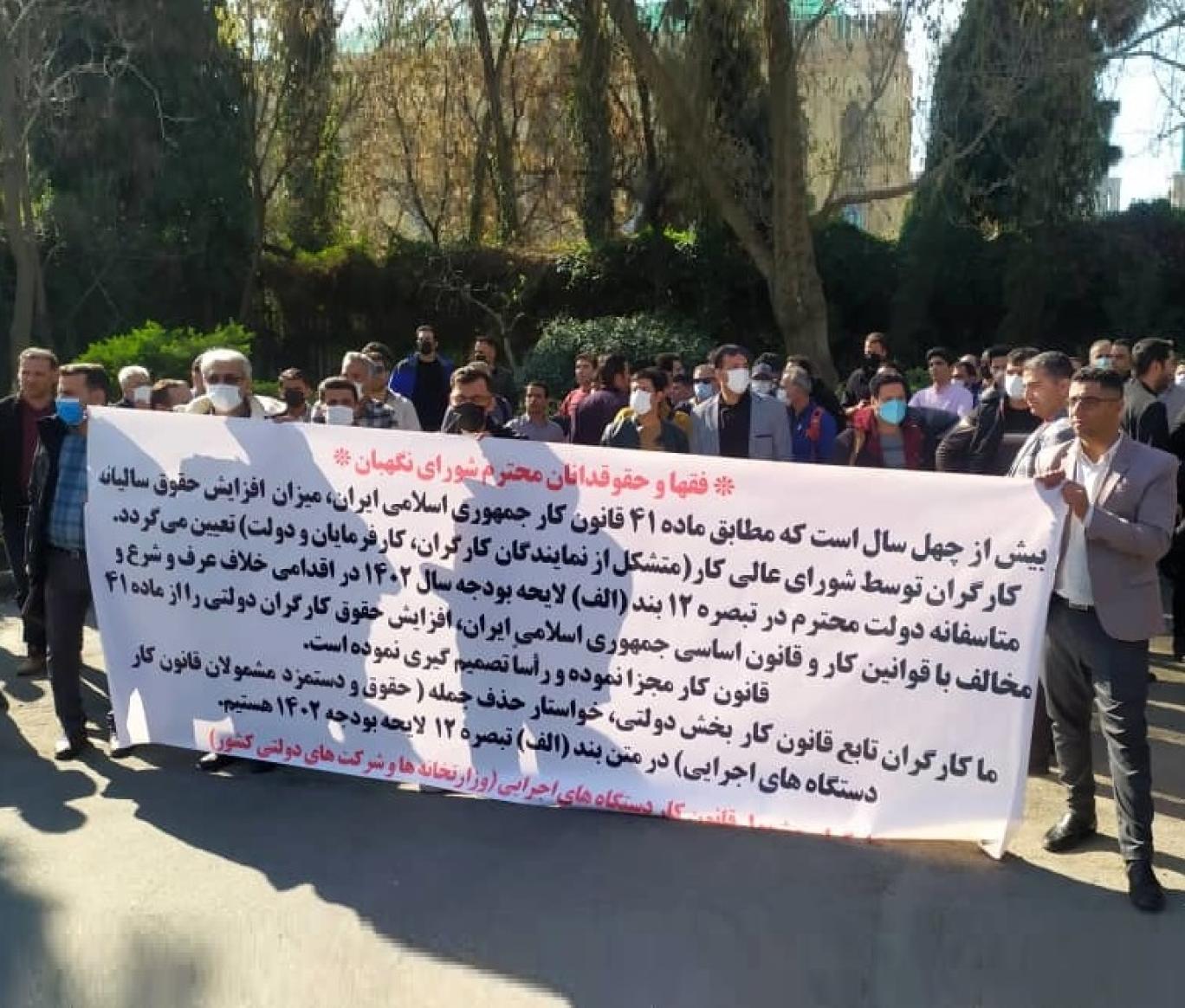 به گزارش ایلنا در این تجمع، افرادی از نهادهای مختلف از جمله وزارت نفت و کلاهزردهای وزارت نیرو حضور داشتند. کارگران از شهرهای مختلف به تهران آمدند تا حذف عبارت «حقوق و دستمزد مشمولان قانون کار در دستگاههای اجرایی» از متن بند الف تبصره ۱۲ لایحه بودجه ۱۴۰۲ را طالب کنند. در این بند از بودجه، مزد کارگران دولت به طور غیرقانونی برابر با افزایش حقوق کارمندان تعیین شده است.