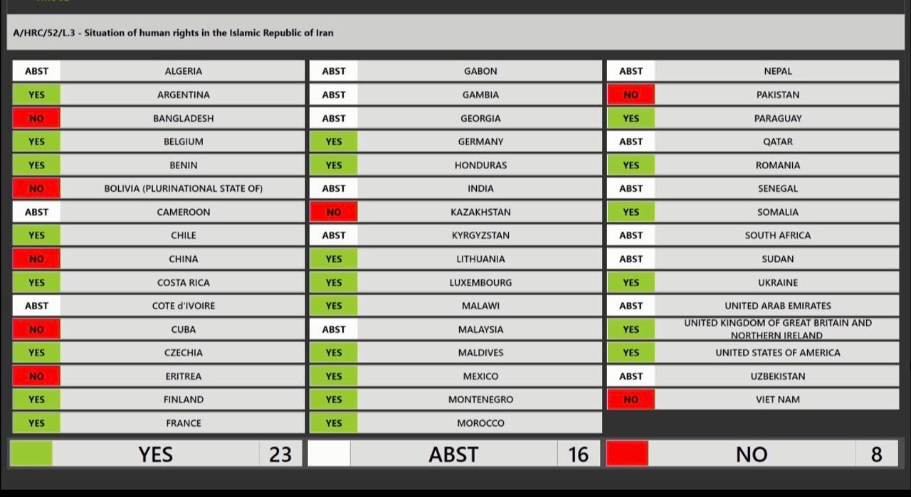 این قطعنامه روز سهشنبه ۱۵ فروردین با رای مثبت ۲۳ کشور عضو از ۴۷ عضو شورای حقوق بشر سازمان ملل در ژنو به تصویب رسید.