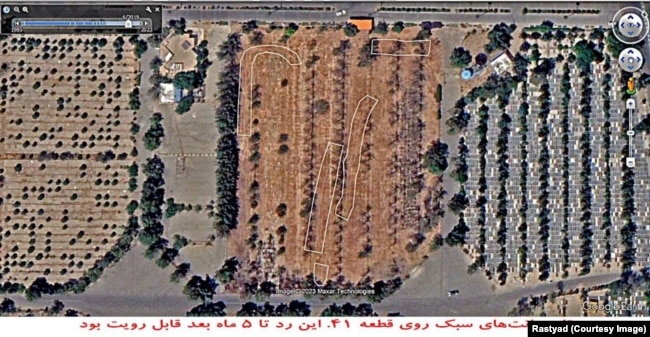 دیوارهای بین قبور این قطعه با بلوک سیمانی برپا شده است. در تصاویر شاهد فرونشست خاک قبرها هستیم اما دیوار بین قبرها ریزش نداشته است. از همه مهمتر، بر اساس تصاویر ماهوارهای ردّ عبور خودرو (باتوجه به فاصله لاستیکها، وانتهایی از جنس پیکان، تویوتا، مزدا یا نیسان) در دستکم سه قسمت از این قطعه به چشم میخورد که کارشان تخلیه سنگقبرهای شکستهشده است.