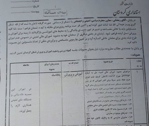 این سند که در کانال تلگرامی شورای تشکلهای صنفی معلمان منتشر شده، گزارشی از مصوبات جلسه کمیته بررسی وضعیت آموزش و پرورش استان کردستان است.