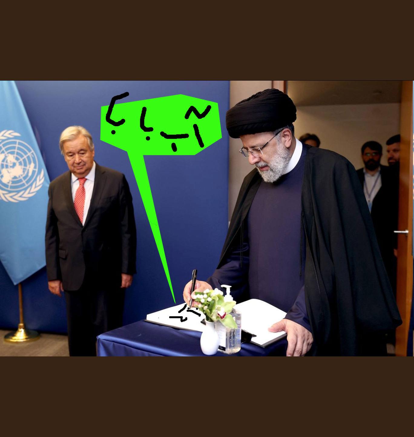 میگویند پرزیدنت رئیسی بعد از سخنرانی تکاندهندهاش برای صندلیهای سالن، خود را در کاخ سازمان ملل پنهان میکند اما ماموران اعزامی رژیم خیلی زود دستگیرش میکنند. ظاهرا رئیسی در همان خلایی قایم شده بوده که سالها پیش پرزیدنت خاتمی برای رو به رو نشدن با کلینتون، در آنجا خودش را مخفی کرده بود. هنگام هجوم ماموران رئیسی داشته بر دیوار مستراح یادگاری مینوشته. (آب بابا بار مینوشته.)