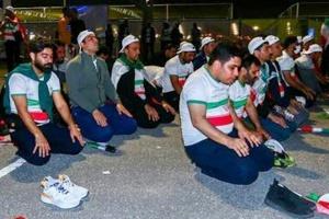 نماز جماعت هواداران صادراتی جمهوری اسلامی قبل از بازی تیم ملی فوتبال در قطر: