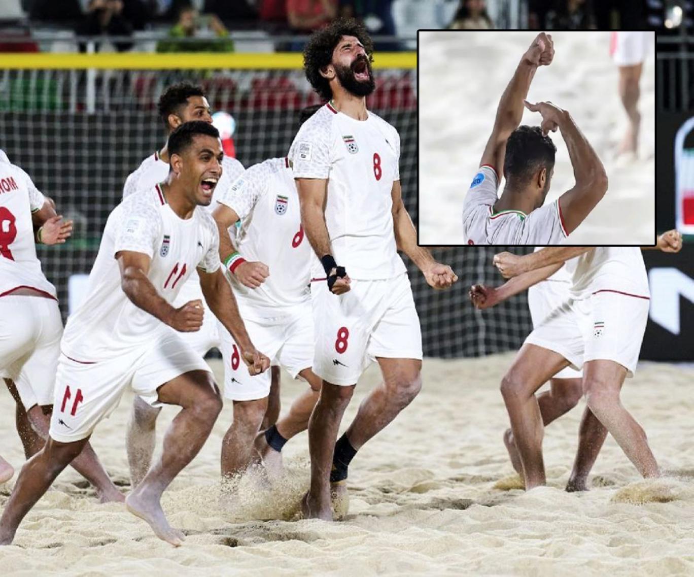 خوشحالی بازیکنان تیم ملی فوتبال ساحلی ایران پس از برد امارات در جام جهانی، بهمن۱۴۰۲‌ــ فیفا