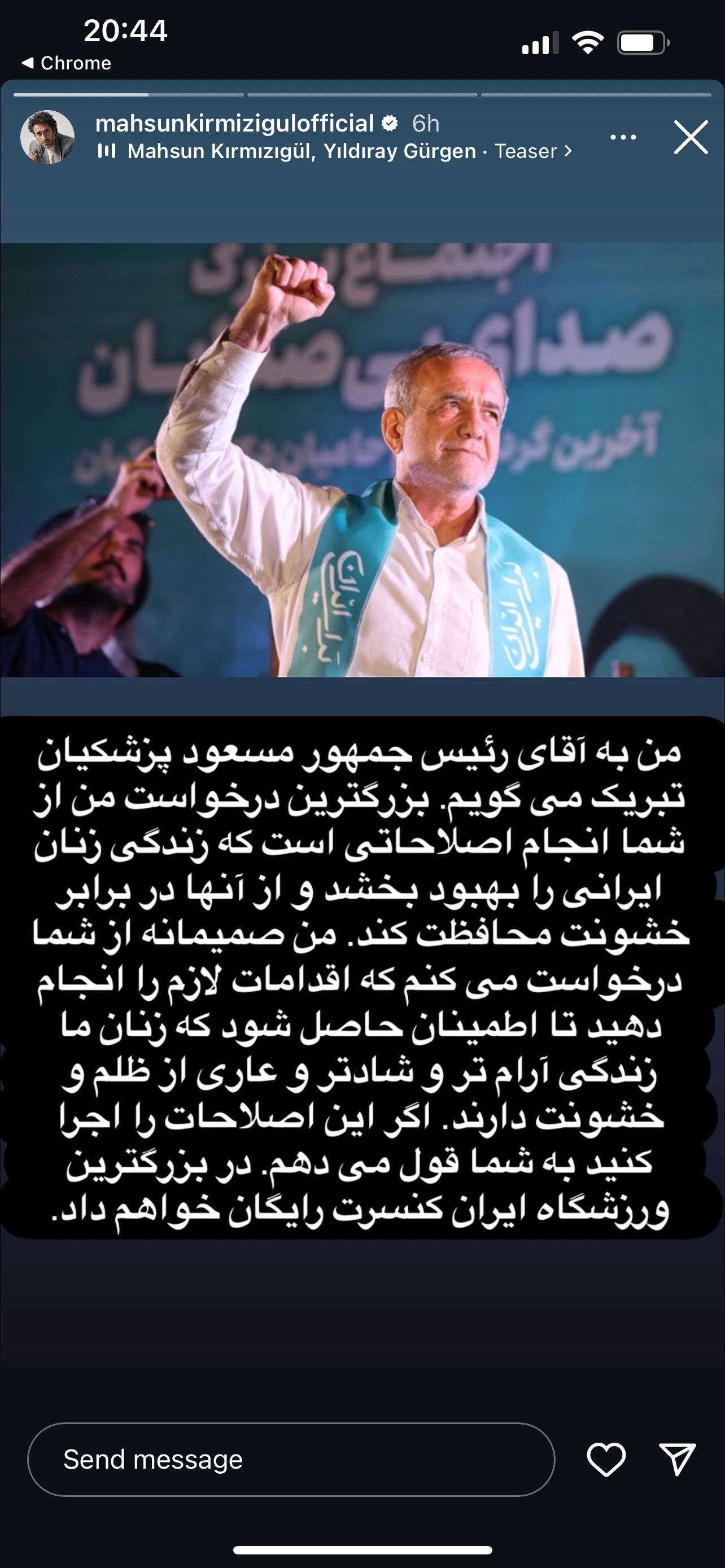 ماهسون قرمزیگل، خواننده و بازیگر ترکیهای در اینستاگرام خطاب به مسعود پزشکیان خواهان انجام اصلاحاتی شد که زندگی زنان ایرانی را بهبود ببخشد و از آنها در برابر خشونت محافظت کند. او همچنین خواستار اقداماتی شد که اطمینان حاصل شود زنان زندگی عاری از ظلم داشته باشند.