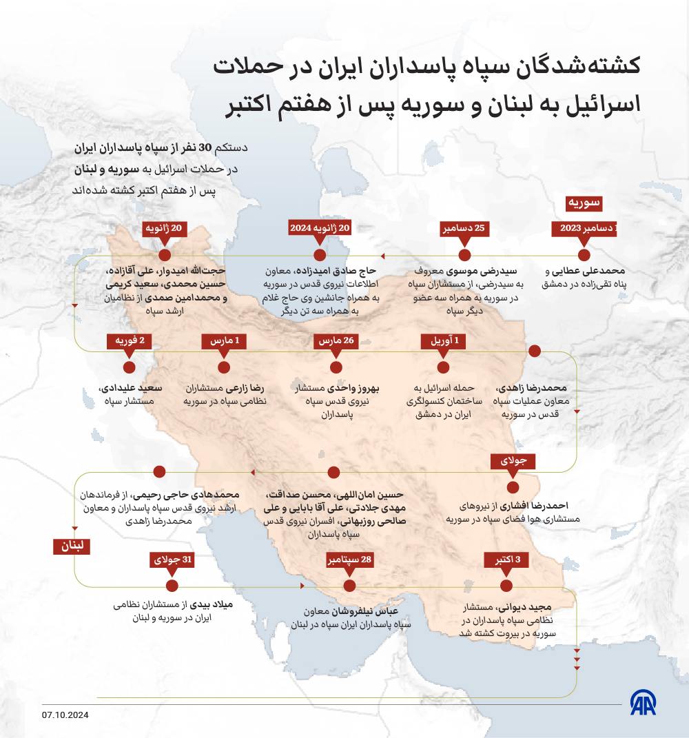 دستکم ۳۰ نفر از سپاه پاسداران ایران در حملات اسرائیل به سوریه و لبنان پس از هفتم اکتبر کشته شدهاند.