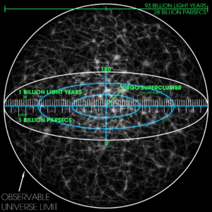 “A simulated view of the entire observable universe”, approximately 93 billion light years (or 28.5 billion parsecs) in diameter.۱