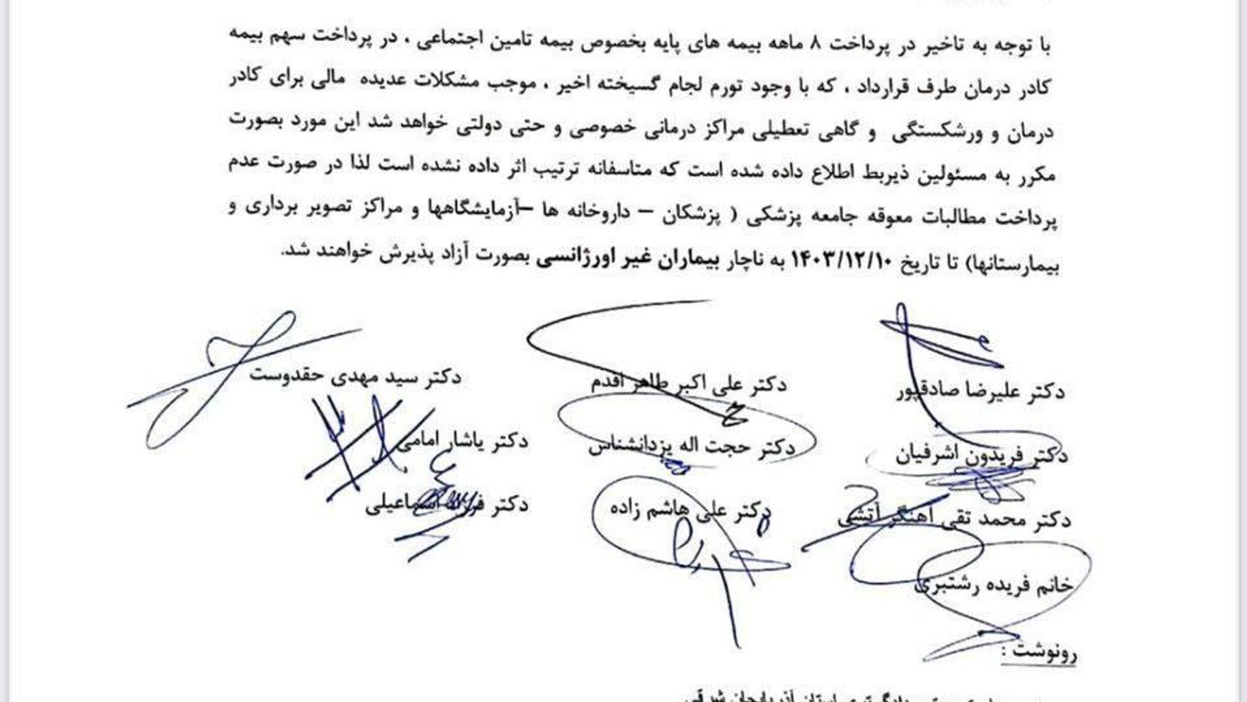 در این نامه آمده است: «با توجه به تاخیر در پرداخت هشت ماهه بیمههای پایه بهخصوص بیمه تامین اجتماعی، در پرداخت سهم بیمه کادر درمان طرف قرارداد، که با وجود تورم لجامگسیخته اخیر، موجب مشکلات عدیده مالی برای کادر درمان و ورشکستگی و گاهی تعطیلی مراکز درمانی خصوصی و حتی دولتی خواهد شد این مورد بهخصوص مکرر به مسئولان اطلاع داده شده که متاسفانه ترتیب اثر داده نشده است، لذا در صورت عدم پرداخت مطالبات معوقه جامعه پزشکی تا تاریخ دهم اسفند، به ناچار بیماران غیراورژانسی به صورت آزاد پذیرش خواهند شد.»