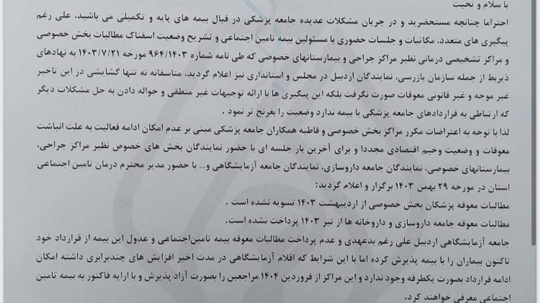 سازمانهای نظام پزشکی اردبیل و تبریز در نامههایی جداگانه به استانداریهای این دو استان اعلام کردند که بهدلیل عدم پرداخت مطالبات از سوی سازمان تامین اجتماعی، خدمات خود را به بیماران محدود خواهند کرد. ایراناینترنشنال نسخههایی از این نامهها را مشاهده کرده است.