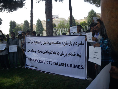 سایت ملیون ایران: صبح ۲۵ مرداد ۱۳۹۳ از حدود ساعت ۱۰ صبح جمعی از اکراد استان کرمانشاه و برخی استانهای اطراف به دعوت «مجمع مشورتی فعالان مدنی یارسان» در اعتراض به جنایات داعش در حق کردهای ایزدی در برابر استانداری کرمانشاه تجمع و خواهان کمک به آنان شدند. اکثریت مطلق افراد از کردهای اهل حق بوده و برخی فعالان مدنی به سان بزرگان اهل حق، برادر شهید کیانوش آسا نخبۀ کرد اهل حق، برخی فعالان مدنی و حقوق بشر کرمانشاه و… هم در جمع حضور داشتند.